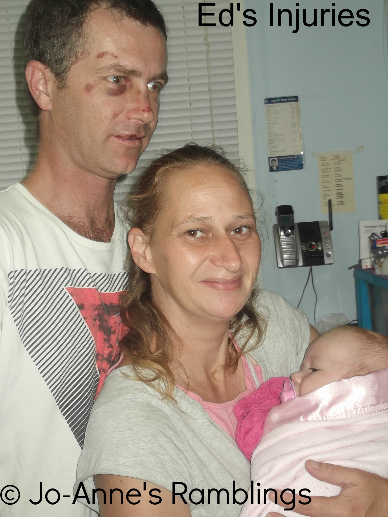 In the week before Christmas my brother in-law Ed had a fall, he fell over on his face and was unconscious and had to be taken to hospital. He had not been drinking or anything and had his daughter my niece Temika with him they were visiting a mate of his and his mates family. The mate rang my sister who arranged for a friend to watch her baby Denni while she went to where Ed was.