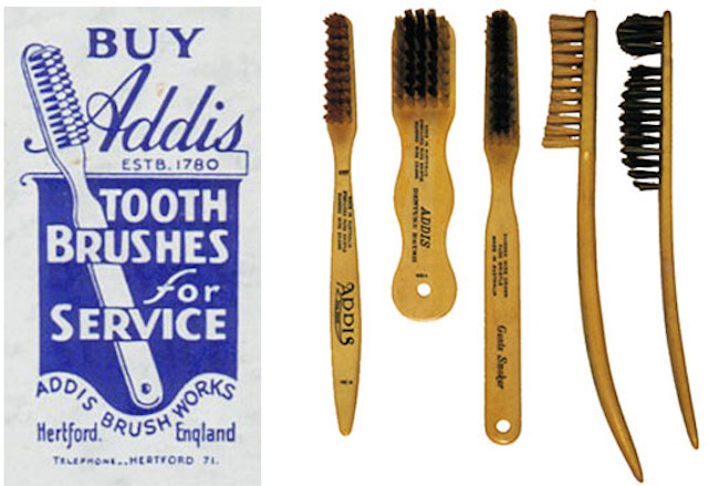 The first toothbrush of a more modern design was made by William Addis in England around 1780 – the handle was carved from cattle bone and the brush portion was still made from swine bristles. In 1844, the first 3-row bristle brush was designed. It was while he was in gaol for causing a riot that he decided that the method used for cleaning ones teeth was ineffective at the time it was common to just rub a rag with soot and salt over the teeth.