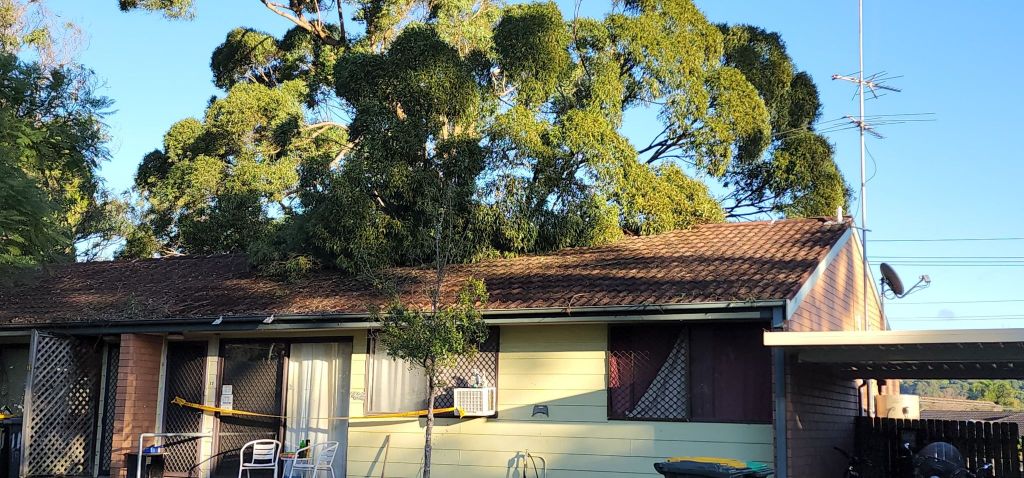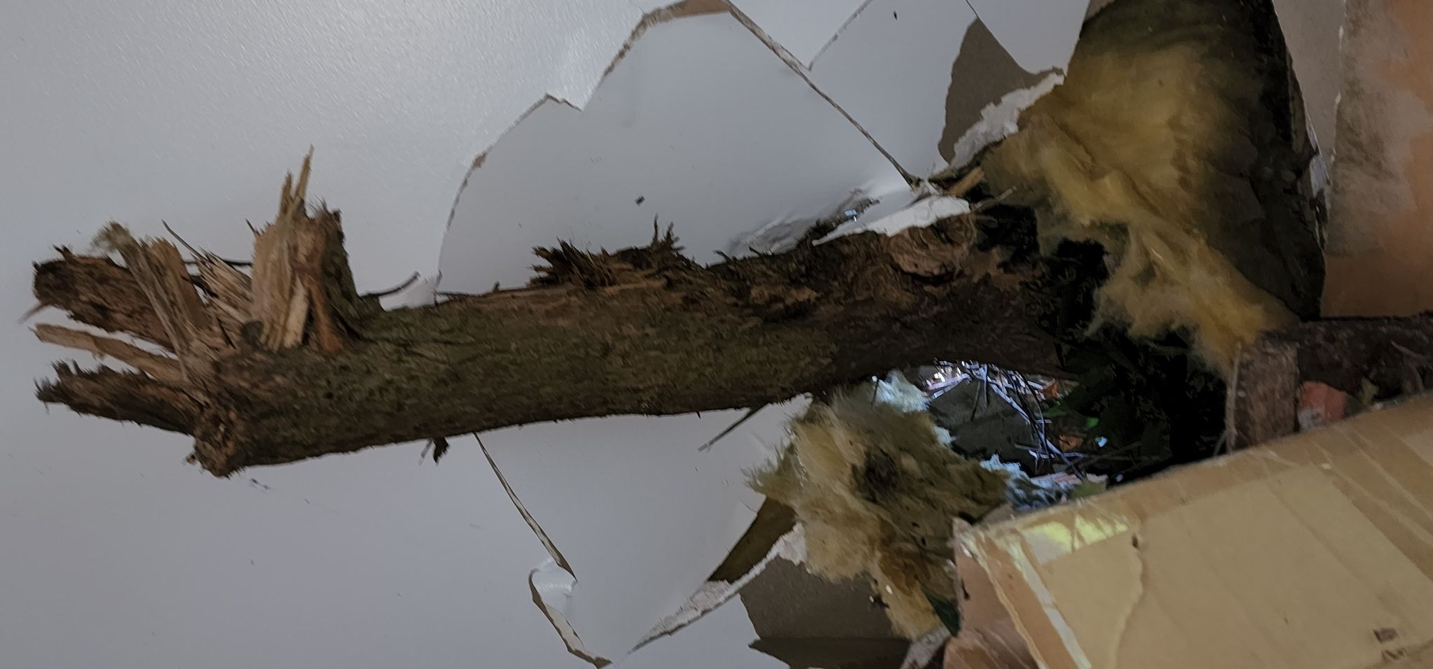 There is a strong wind and I can hear the tarp flapping and it sounds like a tile threw off the roof. Tim will need to check outside when he gets up.