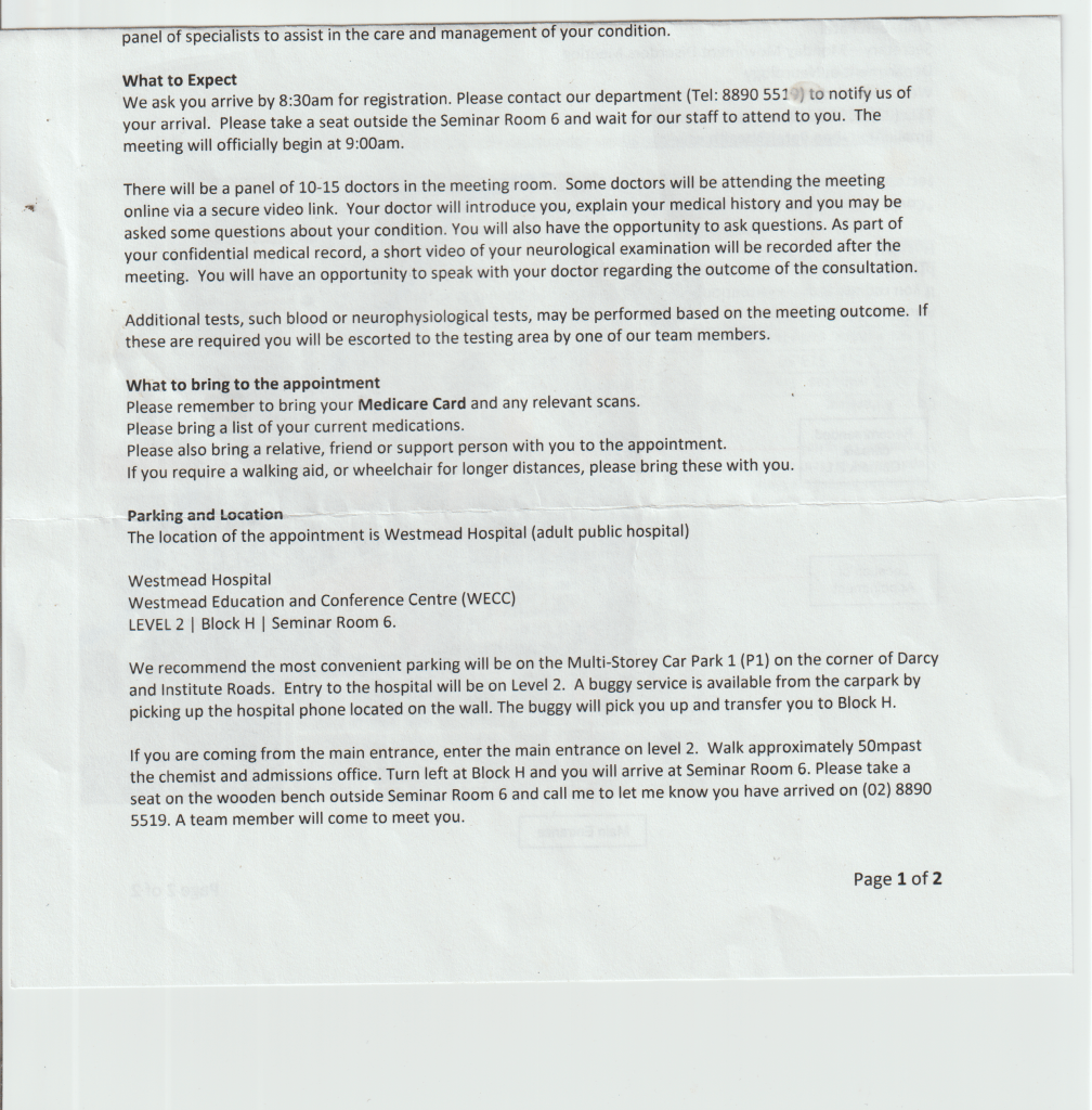 The appointment went well I was in a room with a dozen or so doctors. I had to walk, stand, move my arms and head. Afterwards I was filmed doing the same stuff for the Dr’s records. I have been prescribed another medication to try it is one used for Parkinson’s I hope it helps.