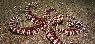 Maybe its most incredible morph, however, is when imitating the venomous banded sea snake. It conceals six of its arms in the sand and raises the other two now z,covered in thick black and beige stripes, in opposite directions to resemble the snake.